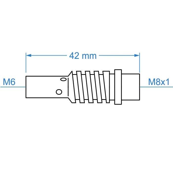 Łącznik prądowy ze sprężyną  do uchwytów MIG/MAG MB15. Gwint wewnętrzny lewy M8, gwint na końcówkę prądową M6.